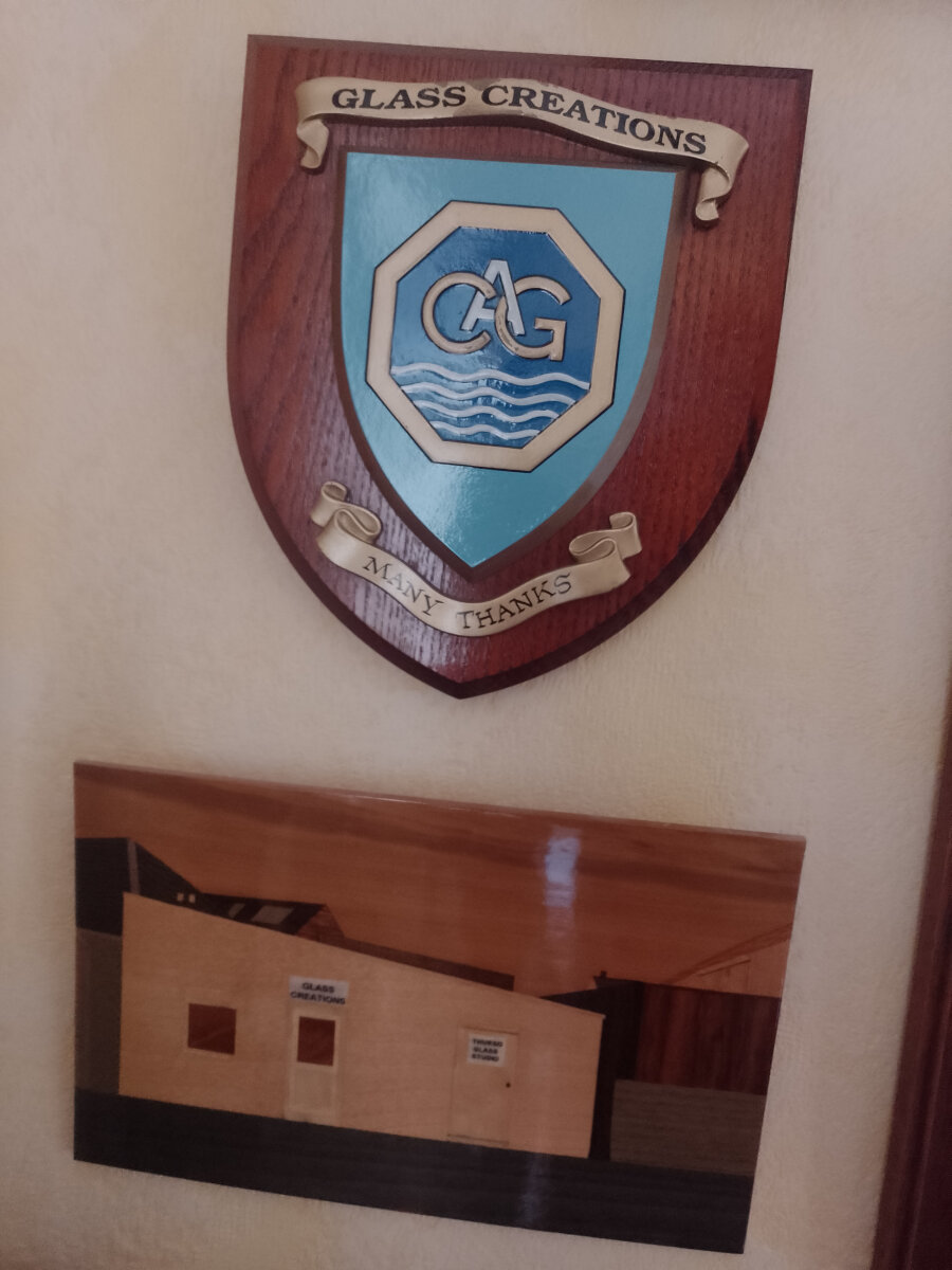 Interesting to see what and how other artists interpret my studio and work. I have had my studio painted by at least three different artists. I have been presented with a sandblasted Glass Creations logo and also an image of my workshop sandblasted on sheet glass. I have had a wooden shield made customised to represent Glass Creations. In addition, my portrait working on the flame has been captured on film and canvas!