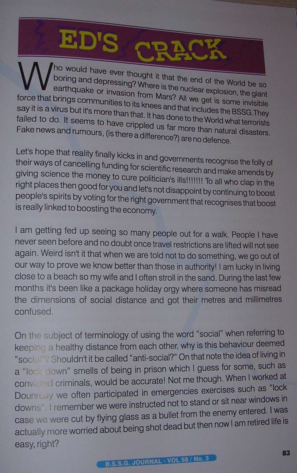 Who would have ever thought it that the end of the World be so boring and depressing? Where is the nuclear explosion, the giant earthquake or invasion from Mars? All we get is some invisible force that brings communities to its knees and that includes the BSSG.They say it is a virus but it’s more than that. It has done to the World what terrorists failed to do. It seems to have crippled us far more than natural disasters. Fake news and rumours, (is there a difference?) are no defence. Let’s hope that reality finally kicks in and governments recognise the folly of their ways of cancelling funding for scientific research and make amends by giving science the money to cure politician’s ills!!!!!!! To all that clap in the right places then good for you and let’s not disappoint by continuing to boost people’s spirits by voting for the right government that recognises that boost is really linked to boosting the economy.