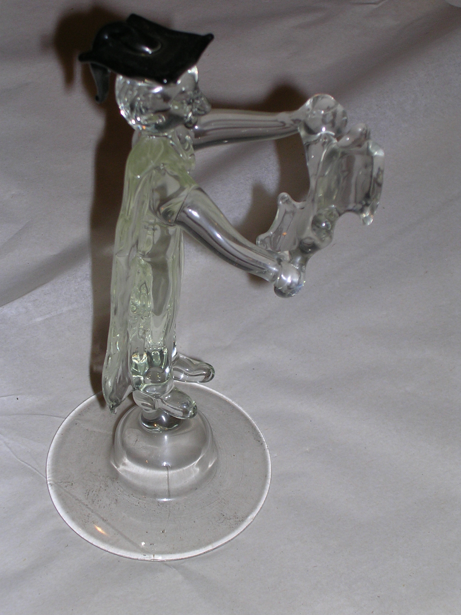 After school comes universities although in my case it was working hard in a job. Still for those that have managed to avoid work focusing on nurturing a career then if they have been lucky, they might graduate. This involves a ceremony where students get the chance to wear weird hats. I think these are known as mortar boards. God knows why as I thought mortar boards were used by builders to mix cement on. Its easy to make a glass figure in a gown and mortar board. Just a flat piece of glass on a person’s head. Technically the challenge is not to fuse too much the flat glass on the round head since one ends up with a blob. If you don’t fuse enough, then glass will crack resulting in two blobs! Since I use clear glass then to create authenticity, I have to paint the glass black. If one views a figure form a certain angle, then the black mortar gives the impression the student has a black head. Must be like acne me thinks and will be fine if you don’t pick it.